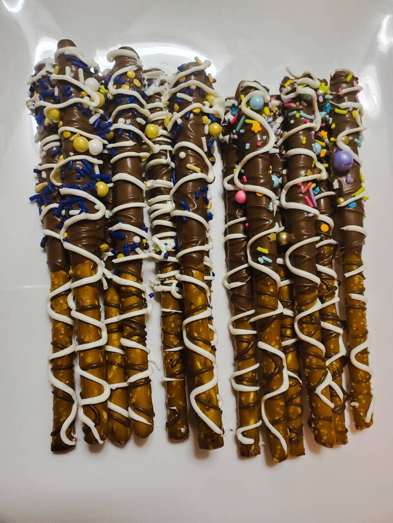 The following are ingredients that you will need and can easily be found at your local grocery store: pretzel rods, chocolate melting chips, white chocolate melting chips and your favorite sprinkles. Parchment or butcher paper are very helpful for an easy clean up, piping bags also are a plus.